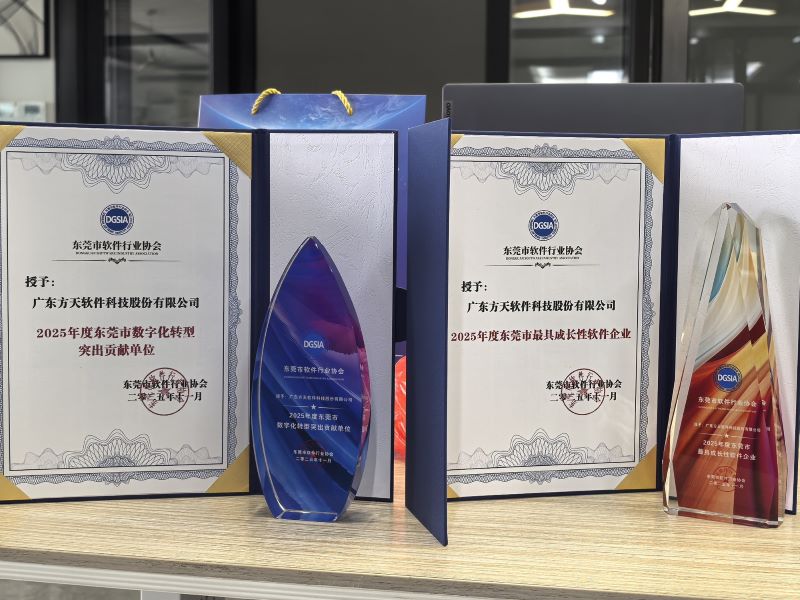 此外,在当晚举行的“软信企业家之夜”暨行业颁奖典礼上,方天软件凭借其在推动本地制造业数字化转型中的突出贡献,荣获“2025东莞市数字化转型突出贡献单位”、“2025东莞市最具成长性软件企业”等称号,充分彰显了其在区域数字经济建设中的标杆地位。