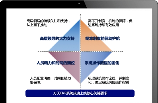 方天软件在产品的研发上,不断的投入人力、物力、时间及资金;同时也在一代一代产品的服务运作中,积极探索服务科学化、标准化、专业化、产业化经营的途径,将方天服务作为一个具有独立品牌的产品来经营,不断的检讨构思、改善,希望能提供给客户一套更完整、更快速、更落实的上线程序,并且把它具体书面化、程序化。