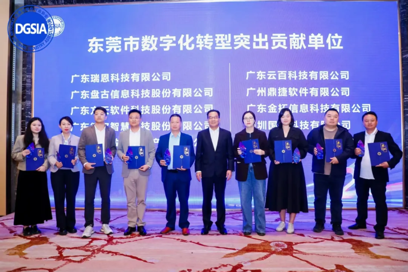 东莞市贸促会党组成员、南城街道党工委委员赖宇诗为获得“2025东莞市最具成长性软件企业”颁发了奖牌证书并合影留念。
